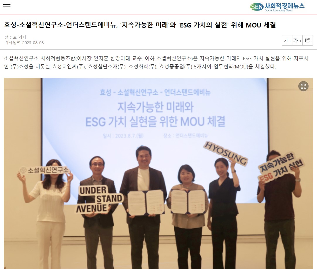 [º¸µµ±â»ç] È¿¼º-¼Ò¼ÈÇõ½Å¿¬±¸¼Ò-¾ð´õ½ºÅĵ忡ºñ´º, 'Áö¼Ó°¡´ÉÇÑ ¹Ì·¡'¿Í 'ESG °¡Ä¡ÀÇ ½ÇÇö' À§ÇØ MOU ü°á - »çȸÀû°æÁ¦´º½º
